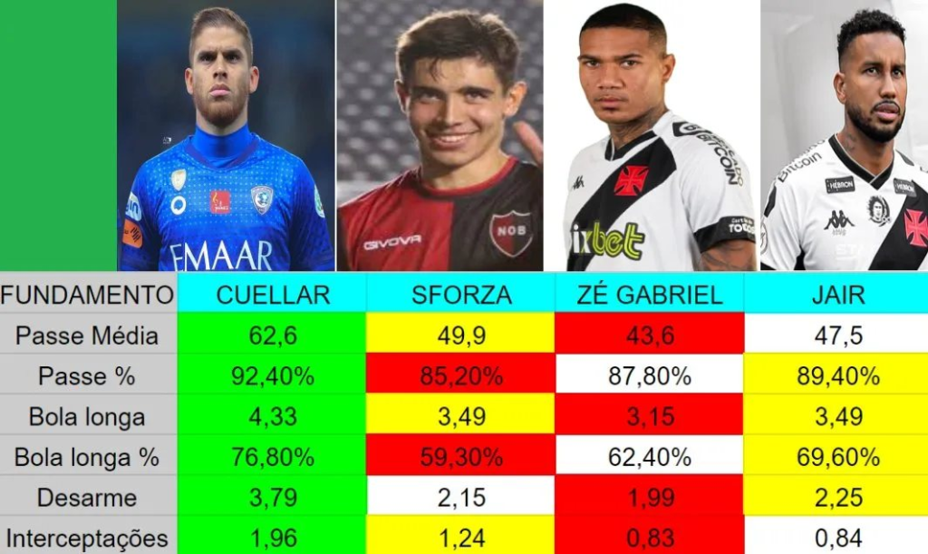 Com a especulação de Cuellar, muito se comparou o volante colombiano com Sforza e outros jogadores atuais da equipe, como Zé Gabriel e Jair. Por isso, o jornalista André Garone, do Blog do Garone, realizou uma pesquisa e constatou que os números de Cuellar são melhores do que os dos outros atletas em todos os quesitos, envolvendo porcentagem de acerto nos passes, desarmes, interceptações, etc.